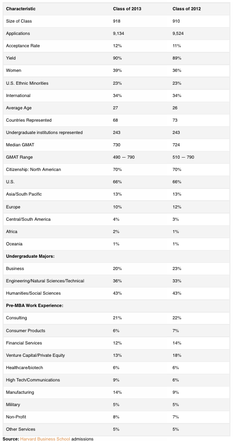 The decline in successful finance candidates confirms an earlier report by PoetsandQuants in December that in its first round acceptances for the Class of 2013, Harvard was turning down highly qualified applicants from private equity firms and i-banks who in earlier years would have gained acceptance. While the actual number of admits affected is relatively small—seven percentage points would represent some 64 out of a class of 918 students in total—it’s still a noteworthy shift at a school where the makeup of the class tends to be remarkably stable from year to year. The composition of the incoming class was made public over the weekend when Harvard Business School posted the details on its website with no explanation or fanfare. A spokesman for the school noted that these are “preliminary figures subject to possible change by the time September rolls around.” Harvard is the first of the top-ranked business schools to disclose the composition of its incoming fall class. The shift away from finance is likely to have reverberations at several other schools, especially Wharton, Columbia, and Chicago Booth, which tend to admit more candidates with financial backgrounds. WOMEN WILL REPRESENT A RECORD 39% OF THE CLASSWomen, meantime, will make up a record 39 percent of the incoming class, up three percentage points from 36 percent for the past two years. It’s the highest percentage of women ever to enter Harvard Business School. Only 28% of the Class of 1995 was female, and in 1975, just 11 percent of the class was composed of women. This is the first class entered under new Dean Nitin Nohira. For admission consultants and others who read Harvard’s tea leaves, the feeling is that Nohria is changing the profile of the traditional HBS class. Several admissions consultants say the school appears to be favoring a more diverse set of applicants from manufacturing, healthcare, the military, the government, and non-profits over those from such financial powerhouses as Goldman Sachs, KKR, and Blackstone. The possible reason: to increase the odds that a higher percentage of future MBAs go into a more diverse range of job opportunities, including more politically correct fields such as social enterprise, entrepreneurship, and health care. ‘HBS IS BECOMING MORE HOSTILE TO PRIVATE EQUITY,’ SAYS A KEY ADMISSIONS CONSULTANT“This confirms my prediction after round one results that HBS is becoming more hostile to private equity, venture capital, investment banking and financial management and more open to women,” says Sanford Kreisberg, president of HBSGuru, an MBA admissions consultant. “This is bad news for private equity and venture capital, unless you just consider this year a fluke.” MEDIAN GMAT SCORES HIT A NEW RECORD AT 730Harvard also reported that the median Graduate Management Admission Test (GMAT) score for the class rose to its highest level ever—730—up six points from the 724 median a year earlier which was itself a new record. The incoming class had a range of GMAT scores from 490 to 790 versus last year’s 510 to 790. The average age of an incoming MBA jumped by a year to 27 years old. Applications fell by four percent, roughly 390 applicants, to 9,134 from 9,524 a year earlier, though Harvard’s class size slightly increased to 918 from 910. The result: the school accepted 12% of its applicant pool, up from 11% last year. Harvard said 90% of the accepted applicants are expected to enroll in the fall. Part of the reason for the decline in private equity and finance may be explained by the percentage of admits with undergraduate degrees in business. They fell to just 20 percent of the incoming class, down from 23% last year and 26% a year earlier. Deirdre Leopold, Harvard’s director of admissions and financial aid, may have prepared applicants for the change when she sent an unusual email to all interviewed applicants a day before the official notification in the first round. In that email, she explained that the diversity of Harvard’s class was more important than the quality of the candidates in the admission process. ”If my job were to rank order candidates from high to low in order of individual strength, whatever that might mean, different decisions might be made,” she conceded. Among other changes, successful applicants with backgrounds in manufacturing showed the largest single jump, to 14 percent from nine percent. “This confirms what Dee often says to kids she gives ding feedback to, ‘Well, if you had been working for Toyota, this might have been different,” adds Kreisberg.“Their darling cohort, healthcare and biotech was flat at six percent both years which leads me to believe good candidates in that field are hard to come by. That’s especially true because that figure includes all the new 2+2 kids who were screened exactly for that and similar backgrounds in life sciences and health-care when they were admitted two years ago.” The 2+2 program allows seniors in college to apply to Harvard Business School. If admitted, they are required to get two years of work experience before coming to Harvard for its two-year MBA program. “Could it be that many of those declared life-science types wound up working for financial firms during their first two years of 2+2???” asks Kreisberg. (See the following page for a complete comparison of the Class of 2013 vs. 1012.) HARVARD BUSINESS SCHOOL CLASS OF 2013 VS. CLASS OF 2012 |